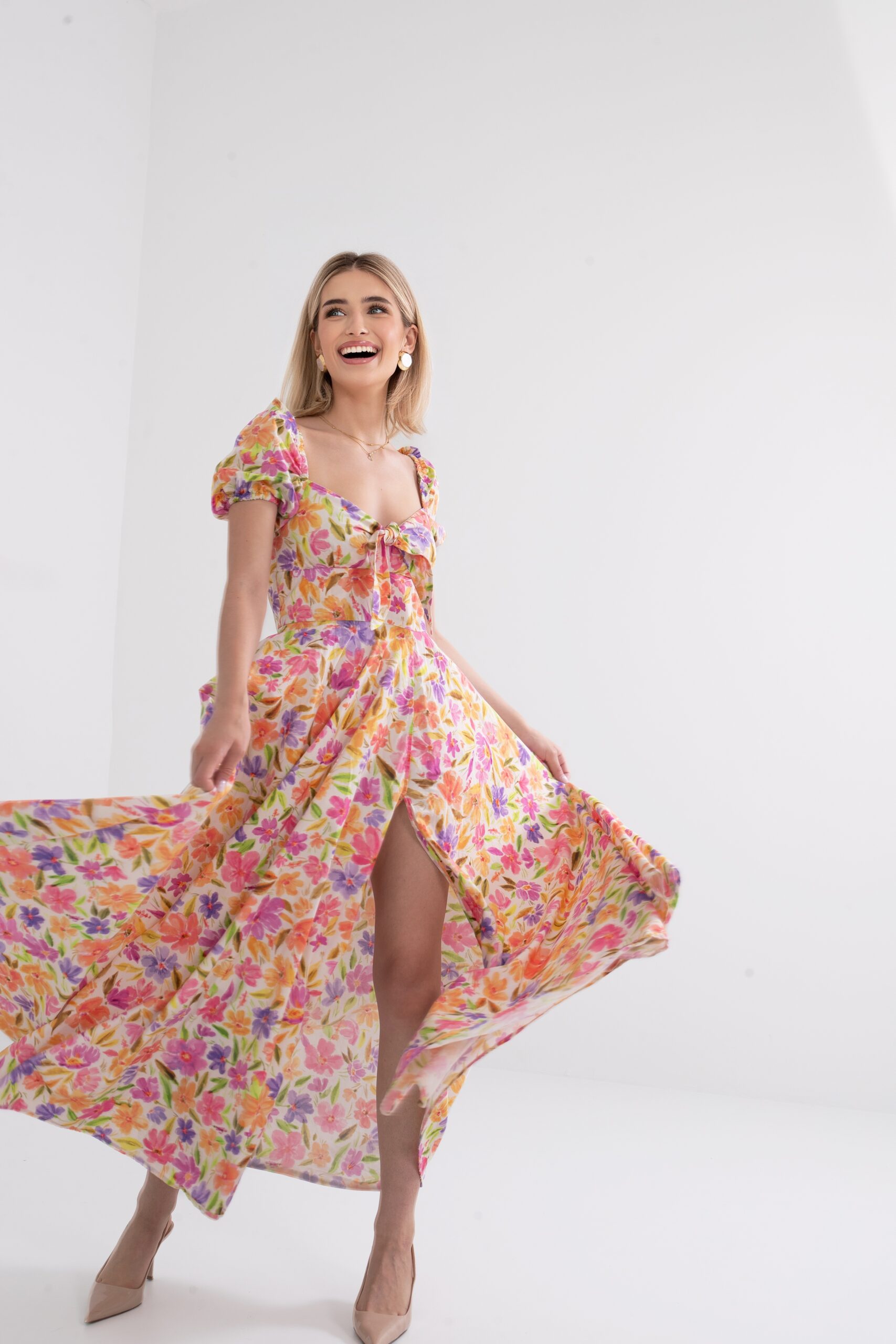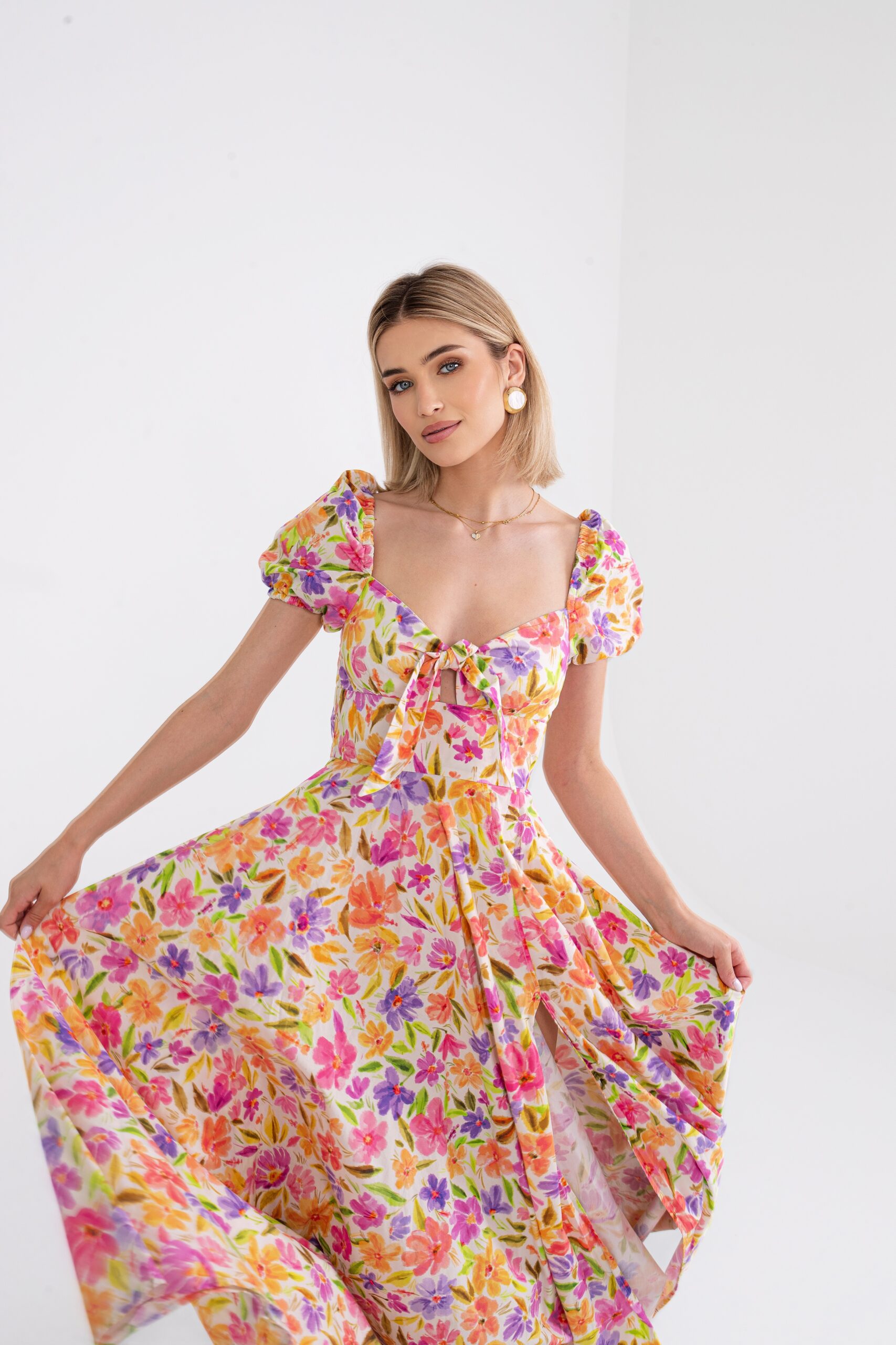 Ta elegancka sukienka maxi z rozporkiem to prawdziwy MUST HAVE tego lata. Wykonana z delikatnego materiału o wysokiej jakości, dzięki czemu zapewnia doskonały komfort noszenia. Jej smukła, dopasowana góra podkreśla kobiece kształty, natomiast długa spódnica delikatnie układa się wokół nóg, dodając lekkości i elegancji.